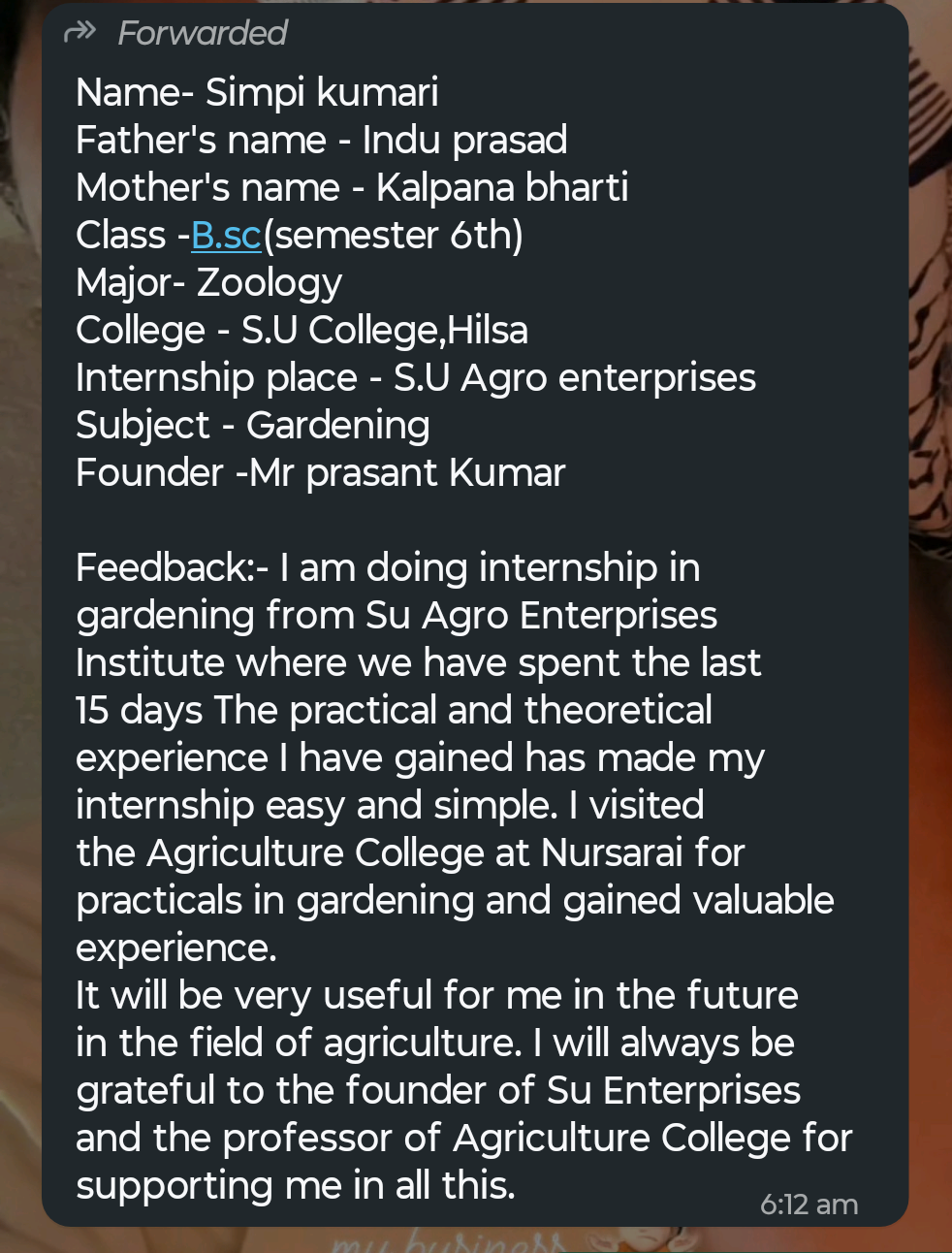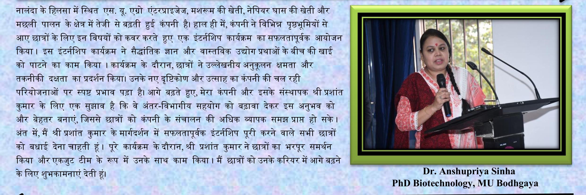 इन्होने मेरे व्यवसाय की शुरुआत से लेकर आज तक मेरा मार्गदर्शन किया है। जब बैंक ने मुझे शुरू में व्यावसायिक ऋण दिया और जानकारी की कमी के कारण हमारा खाता गैर-निष्पादित (एनपीए) हो गया, तब इन्होने ही मेरी मदद की थी। पहले जब हमने मशरूम की खेती शुरू की थी, तब वह मेरे लिए सिर्फ एक ट्रैनर मैम थीं, लेकिन आज वह मेरी मधु आंटी हैं क्योंकि उन्होंने मेरे लिए जो कुछ किया है वह किसी भी खून के रिश्ते से कम नहीं है, बल्कि उससे कहीं अधिक है। व्यवसाय मे मशरूम की खेती से लेकर मेरे जो भी कृषि व्यवसाय है, उसमें इनका भी एक बड़ा योगदान है। इसलिए मै "श्रीमती मधु पटेल जी" आंटी को आभार व्यक्त करता हुँ |