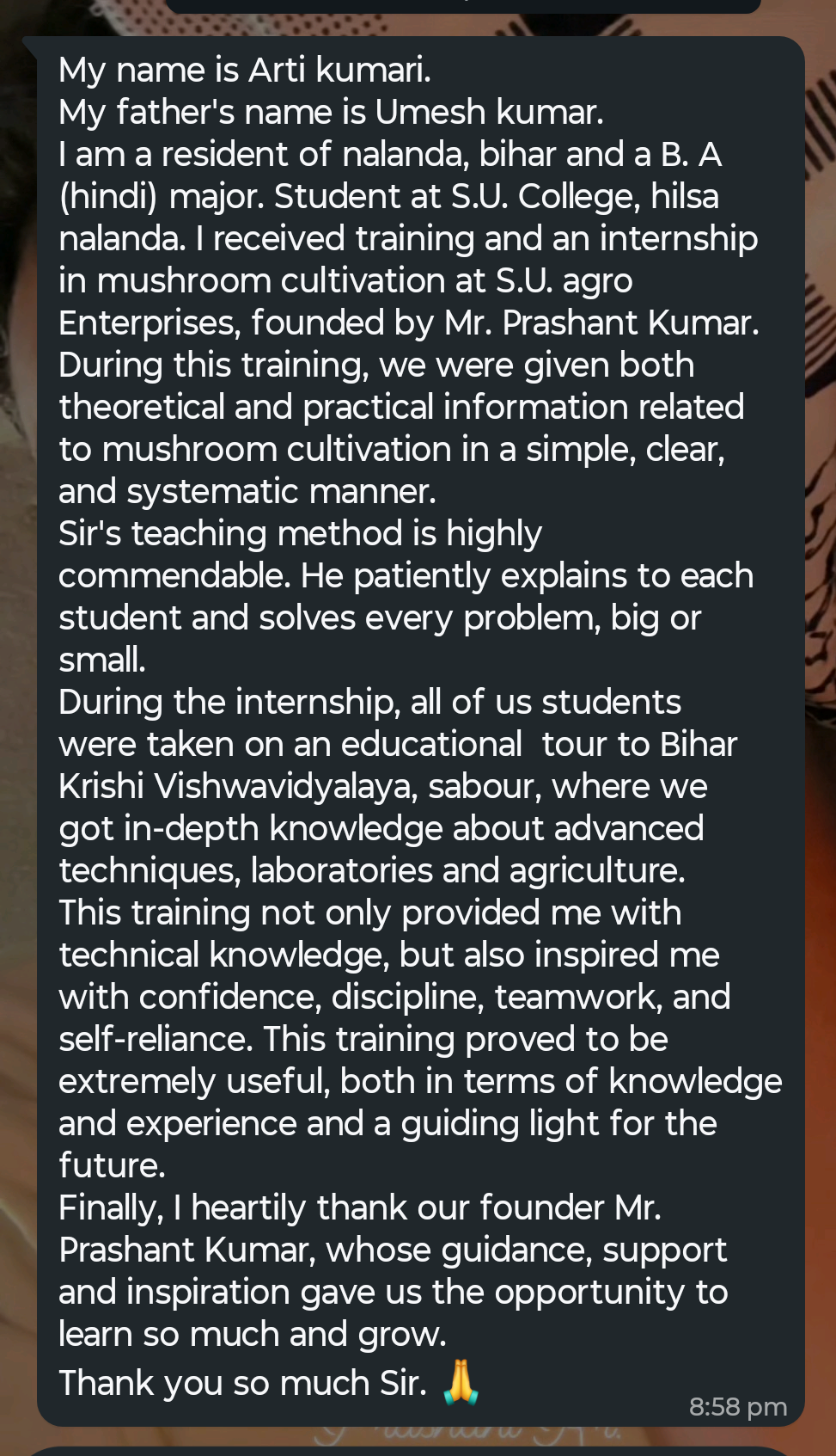 इन्होने मेरे व्यवसाय की शुरुआत से लेकर आज तक मेरा मार्गदर्शन किया है। जब बैंक ने मुझे शुरू में व्यावसायिक ऋण दिया और जानकारी की कमी के कारण हमारा खाता गैर-निष्पादित (एनपीए) हो गया, तब इन्होने ही मेरी मदद की थी। पहले जब हमने मशरूम की खेती शुरू की थी, तब वह मेरे लिए सिर्फ एक ट्रैनर मैम थीं, लेकिन आज वह मेरी मधु आंटी हैं क्योंकि उन्होंने मेरे लिए जो कुछ किया है वह किसी भी खून के रिश्ते से कम नहीं है, बल्कि उससे कहीं अधिक है। व्यवसाय मे मशरूम की खेती से लेकर मेरे जो भी कृषि व्यवसाय है, उसमें इनका भी एक बड़ा योगदान है। इसलिए मै "श्रीमती मधु पटेल जी" आंटी को आभार व्यक्त करता हुँ |
